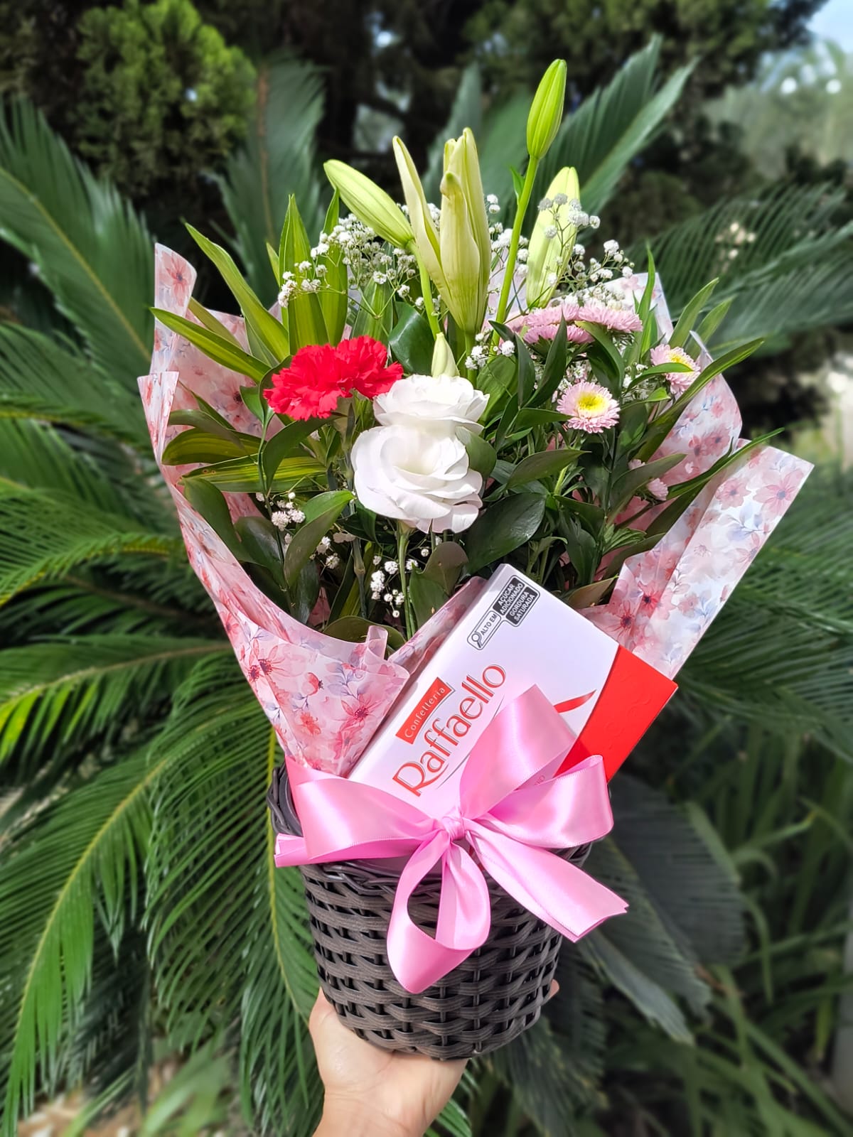 Arranjo com 4 Flores do Campo no cachepot + Raffaello 90g
