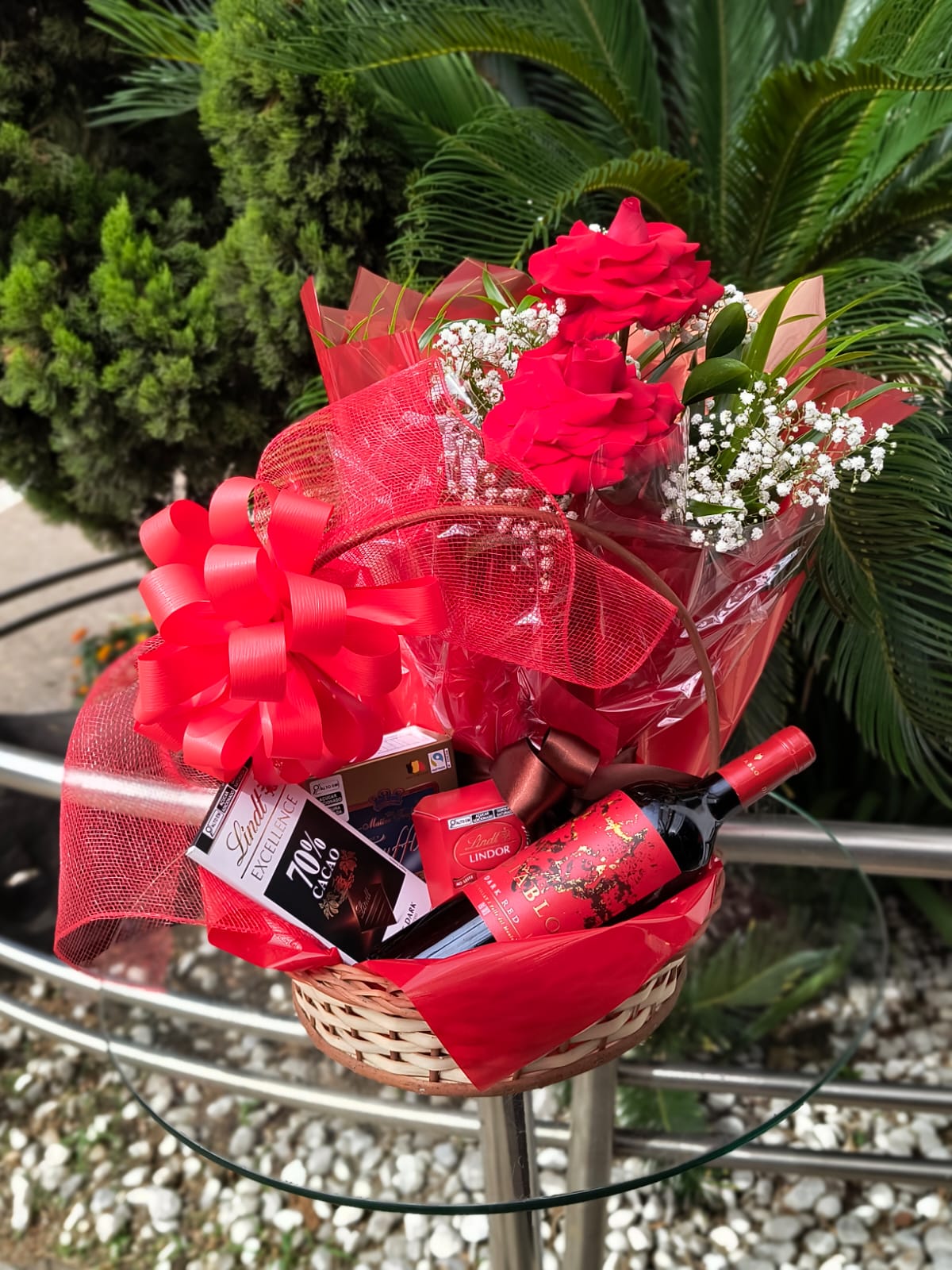 CESTA DECORADA COM ARRANJO DE 2 ROSAS COLOMBIANAS + CHOCO LINDT 70% 100g + CHOCO LINDT 75G AO LEITE + CHOCO TRUFFLES 200g + VINHO TINTO DIABLO RED